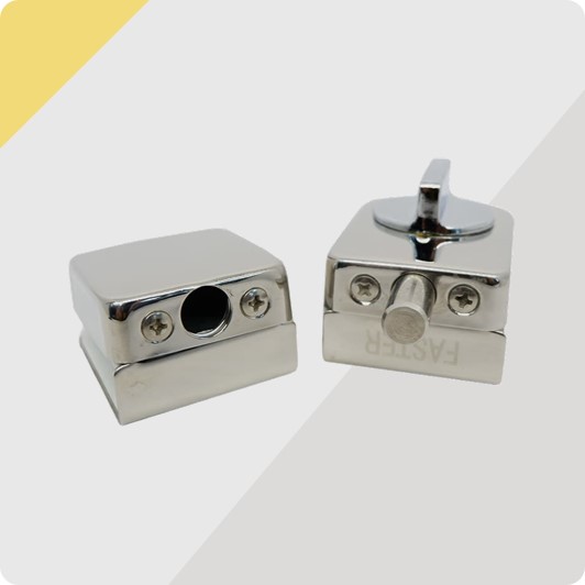 Grendel / kunci shower yang dipasang pada pintu kaca serta tidak menggunakan anak kunci dibuat dari bahan stainless steel anti karat dengan permukaan chrome.