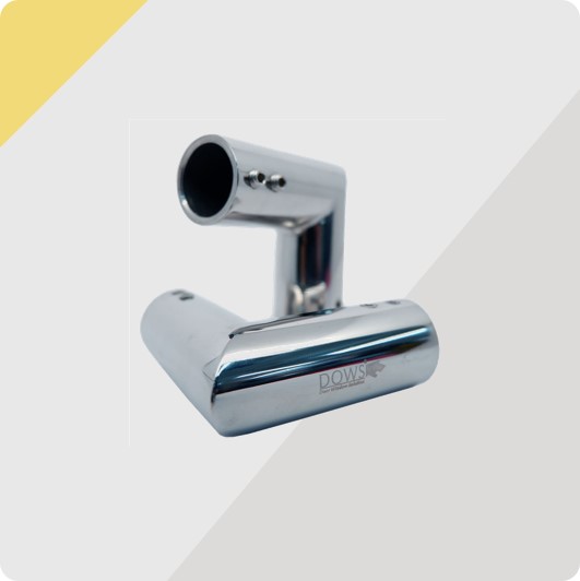 Konektor siku dari bahan stainless steel dan memiliki lapisan chrome digunakan untuk menyambung dan dipasang diatas sekat kaca dengan bentuk sekat kubikal siku.